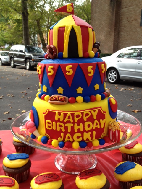 I designed this cake for my son’s 5th birthday to complement the carnival theme of the party. I used the red, blue, and yellow cake to mirror the color scheme. I accented the cake with all of the foods that people would enjoy at a carnival: cotton candy, popcorn, pretzel, peanut, hot dog, and ice cream cone. I knew that we would probably need more servings, so instead of baking another cake, I decided to complement the cake with themed cupcakes. I decorated them with yellow buttercream and accented them with fondant tickets with Jack’s name or age.