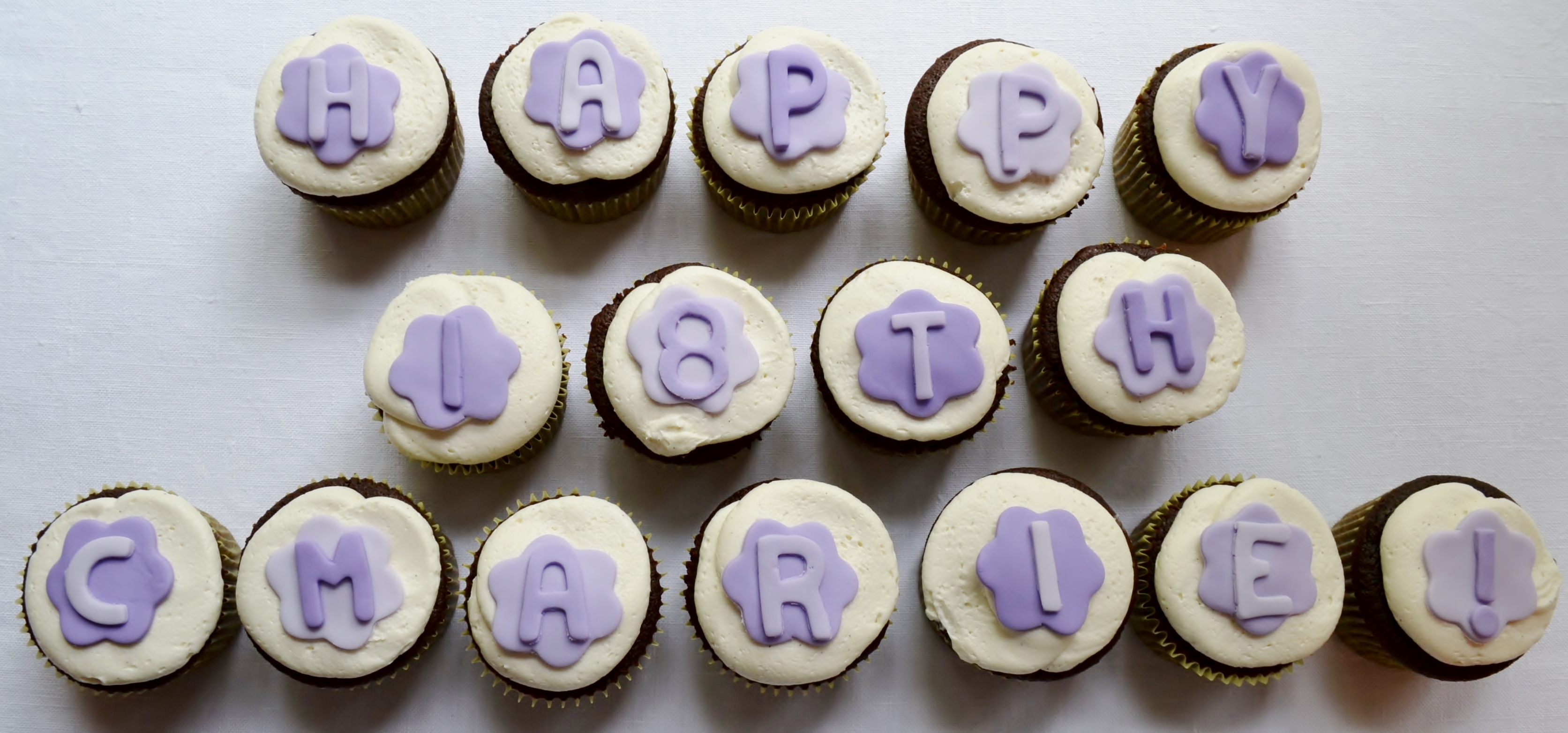 At the last minute, a client emailed and asked if I could make cupcakes for her step-daughter’s birthday. Because of timing, we settled on a fairly simple design spelling out her birthday wish. I used four shades of purple as that is her favorite color.