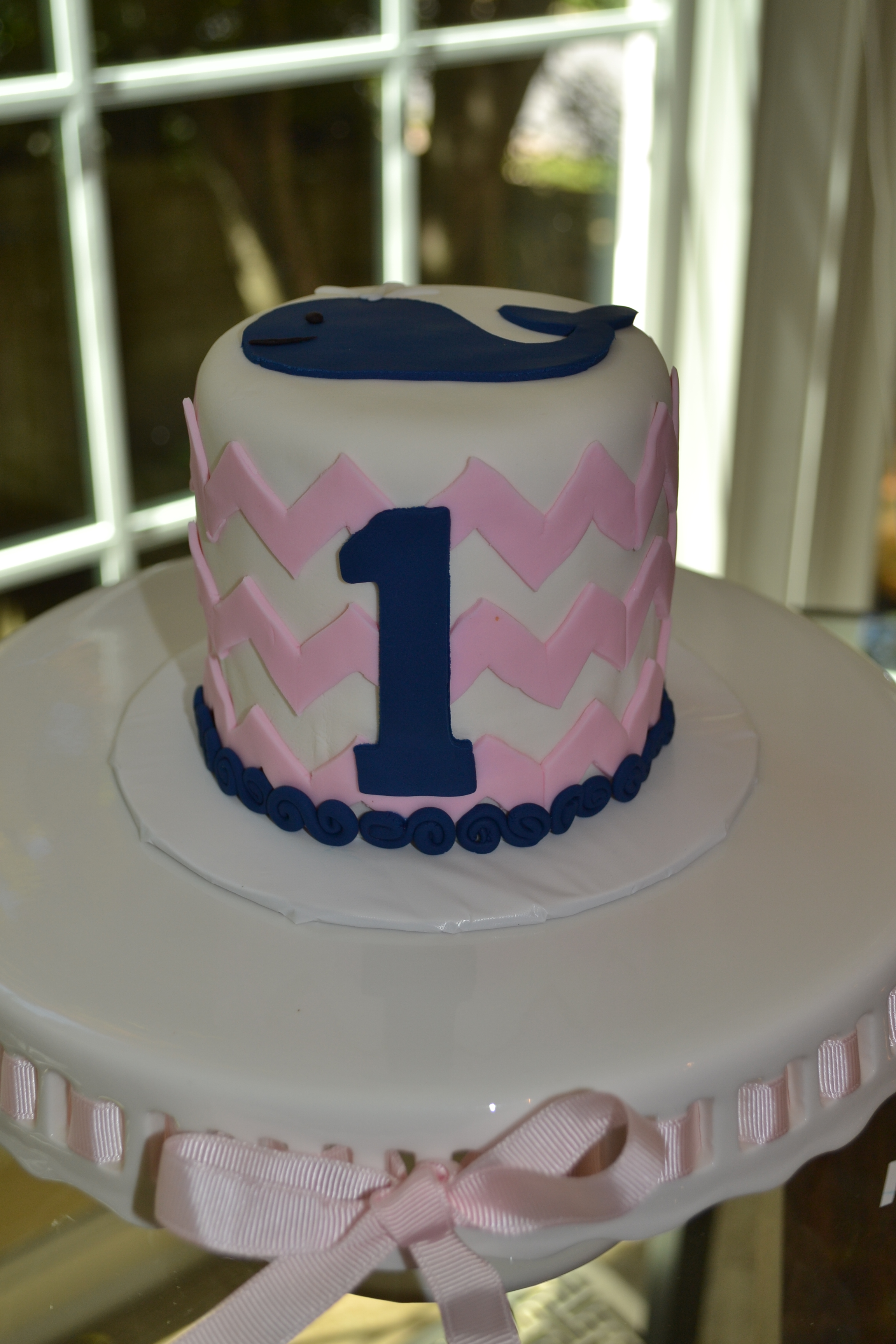 I was lucky enough to be able to work with this client quite extensively on her daughter’s first birthday cake. When she first contacted me, she had a general “nautical theme” in mind. After working through things a bit, she was able to narrow it down to a more specific whale theme. I requested that she send me a few pictures to give me an idea of the type of cake she was looking for. Based on these pictures, I found a few other ideas and sent them back to her. After looking at all of the pictures, we discussed the different ideas, and decided that we wanted to keep it fairly simple with just polka dots, life preservers, and a carved whale on top. A few weeks before the cake was due, I asked if she had an invitation or any other party supplies picked out. I like to try to get as much information as possible to truly customize the cake, and I was hoping to specifically get a feel for the shades of colors she was interested in (we had decided on pink and blue, but not the specific tones). After some discussion, we decided on a light pink and a dark navy. We also changed from the original idea of polka dots to chevron after seeing a banner that she liked. The finished product was a three tiered cake with a carved mini whale cake on top. I also provided her with a “smash” cake the day before so that she could have pictures taken before the party without the chaos of her guests being there.