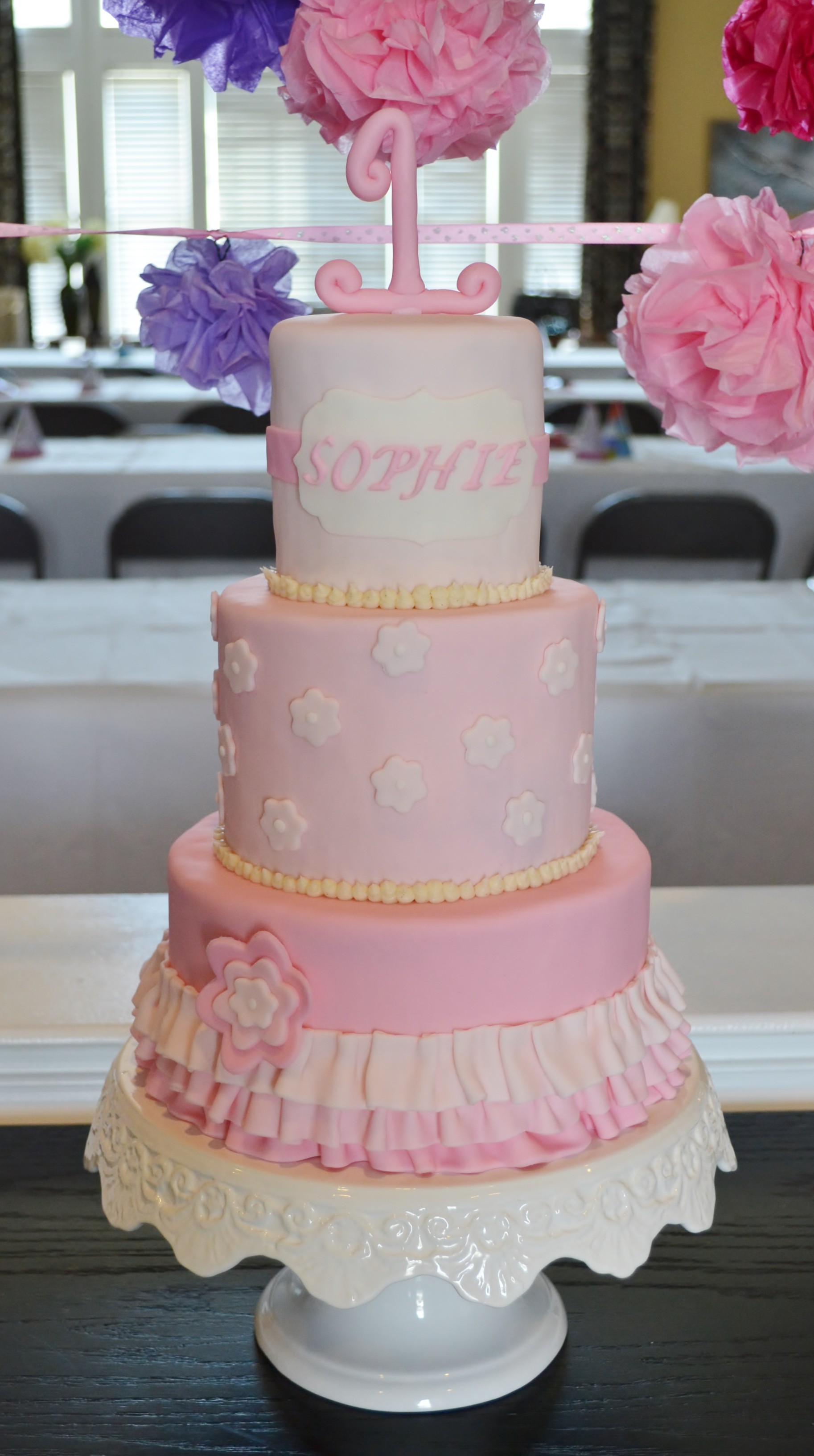 For this birthday cake, my client had one request: ruffles! Because ruffles are so labor intensive, the cost can be a bit higher. For this reason, we compromised on a half ruffle ballerina skirt which gave her the ruffles and look she wanted while still staying within her budget. The half ruffle also gives a bit more of a delicate look to the cake. I completed the “girly” theme by using flower accents, a feminine name plate on the top layer, and a curly “1” on top of the cake.