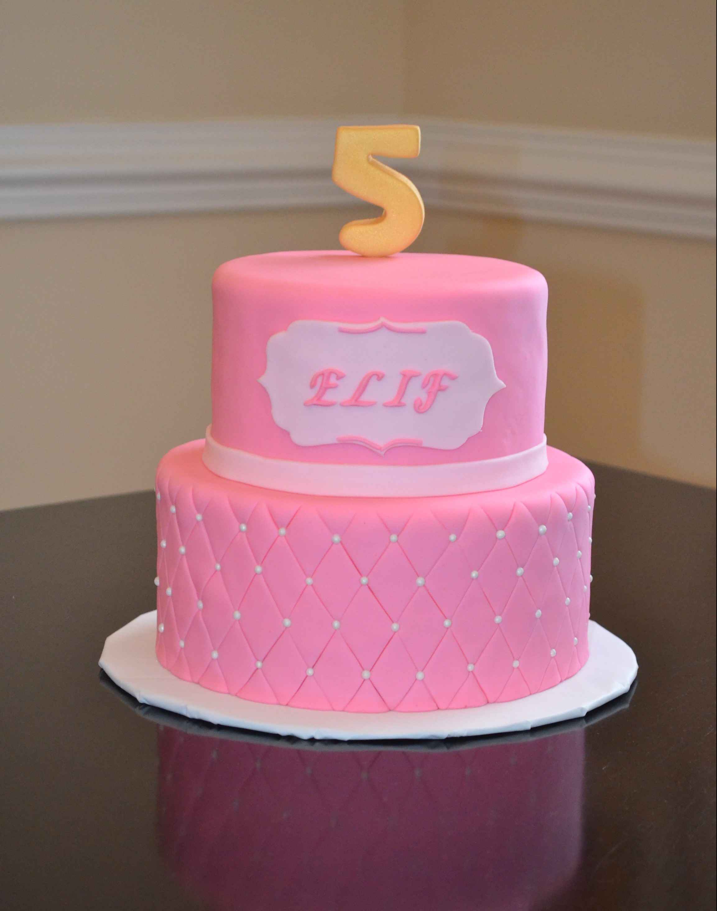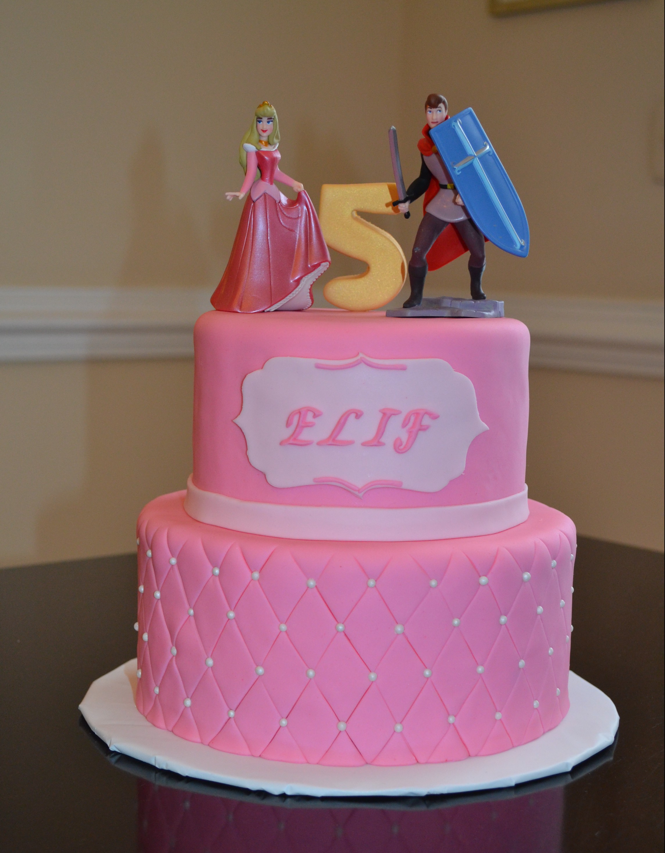 I created a Rapunzel cake for this client and she liked it so much, that she asked me to create a Sleeping Beauty cake for her other daughter’s 5th birthday. I used a quilted look for the bottom tier that I accented with candy pearls. The top layer I kept simple with just a name plate. I topped the cake with a gold, fondant “5.” The client also requested Sleeping Beauty characters which I placed on the cake. I do think that the cake can stand alone, without these characters, but the addition of them definitely gives a much more definitive Sleeping Beauty vibe.