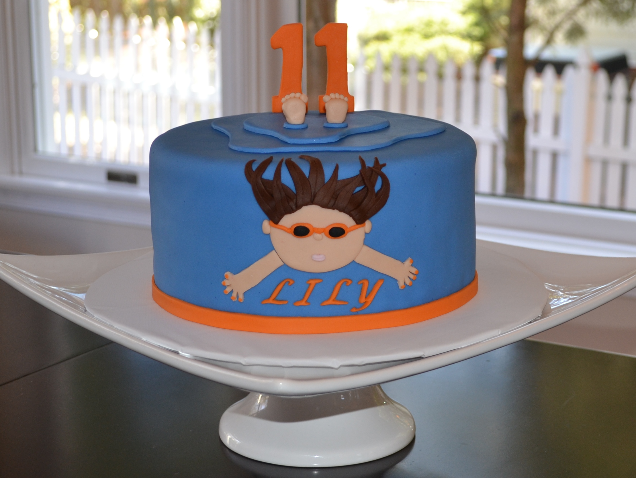 In order to create the perfect cake, I always try to find out as much personal information as I can about the client, especially when they are not having a specific themed birthday. For this client, I was told that she was obsessed with swimming and her favorite color was orange. Based on this information, I created a swimming girl on the cake and used orange as an accent color, even giving her orange finger nail polish. This way, the cake is as specific to the client as possible.
