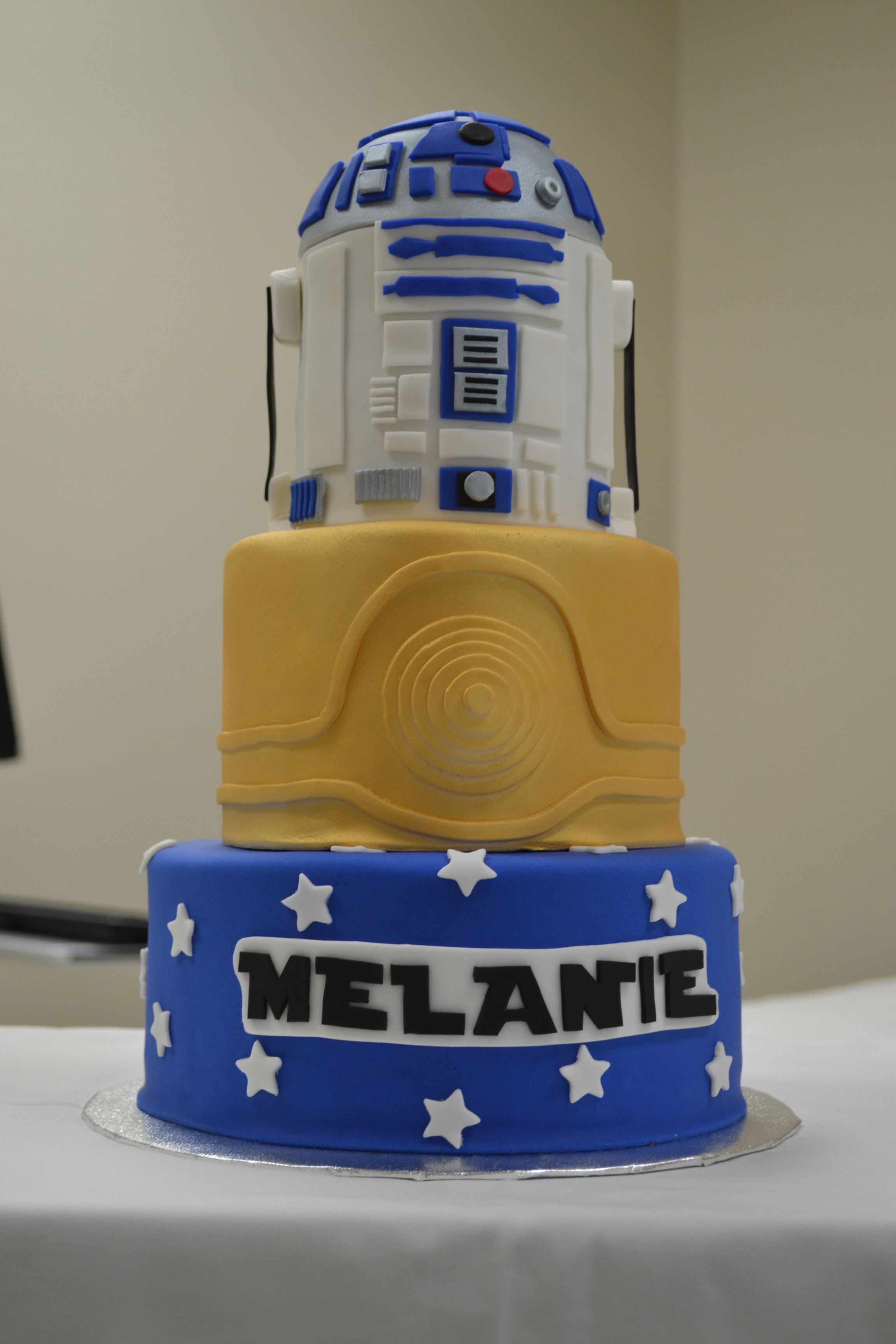My client for this cake was a 14 year old girl who loved Star Wars and wanted a dream cake for her birthday! I decided to use the Star Wars font for her name on the bottom layer, and pair R2D2 and C3PO for the top two tiers. Of course, R2D2 is completely edible with two standard layers of cake and a third round layer on top.