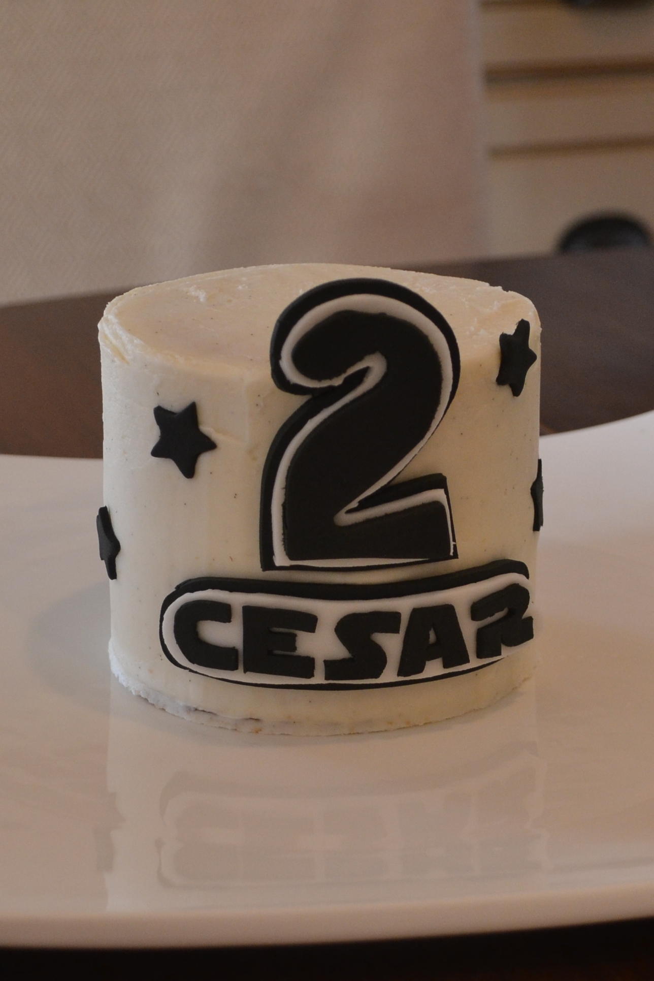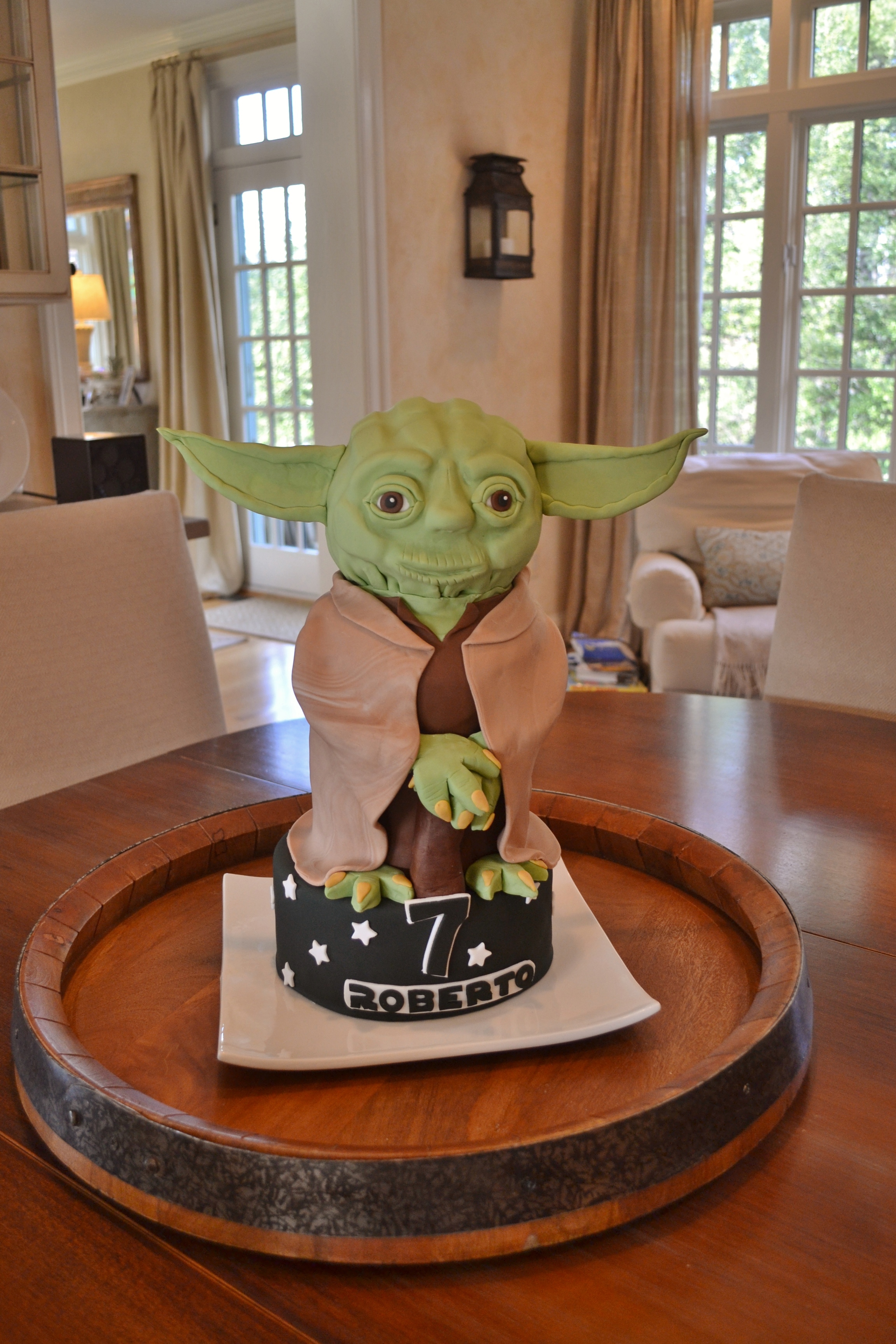 Obviously, all my client wanted for his birthday was a Yoda cake! I first created a base cake with the name and age and then began the work on Yoda himself. The first thing that is important to note, is that this entire creation (with the exception of the ears, which needed a small piece of cardboard for support) is made from cake. My biggest pet peeve is to see an amazing cake, only to discover that a good chunk of it is not edible! For this reason, I strive to make all of my cakes 100% edible. I started with Yoda’s head and used a ball pan to create the basic shape of his head. I then frosted the outside and used fondant to create base features. Finally, I covered the entire cake with a thin layer of fondant and added the finishing details. To create the body, I first stacked four cakes on top of each other (with support and a cardboard round in the the middle) and covered and decorated it with fondant. I then placed the head on top and finished decorating his arms, hands, feet, and cane. The client also has a two year old who has a birthday around the same time, so I created a small cake without fondant for him.