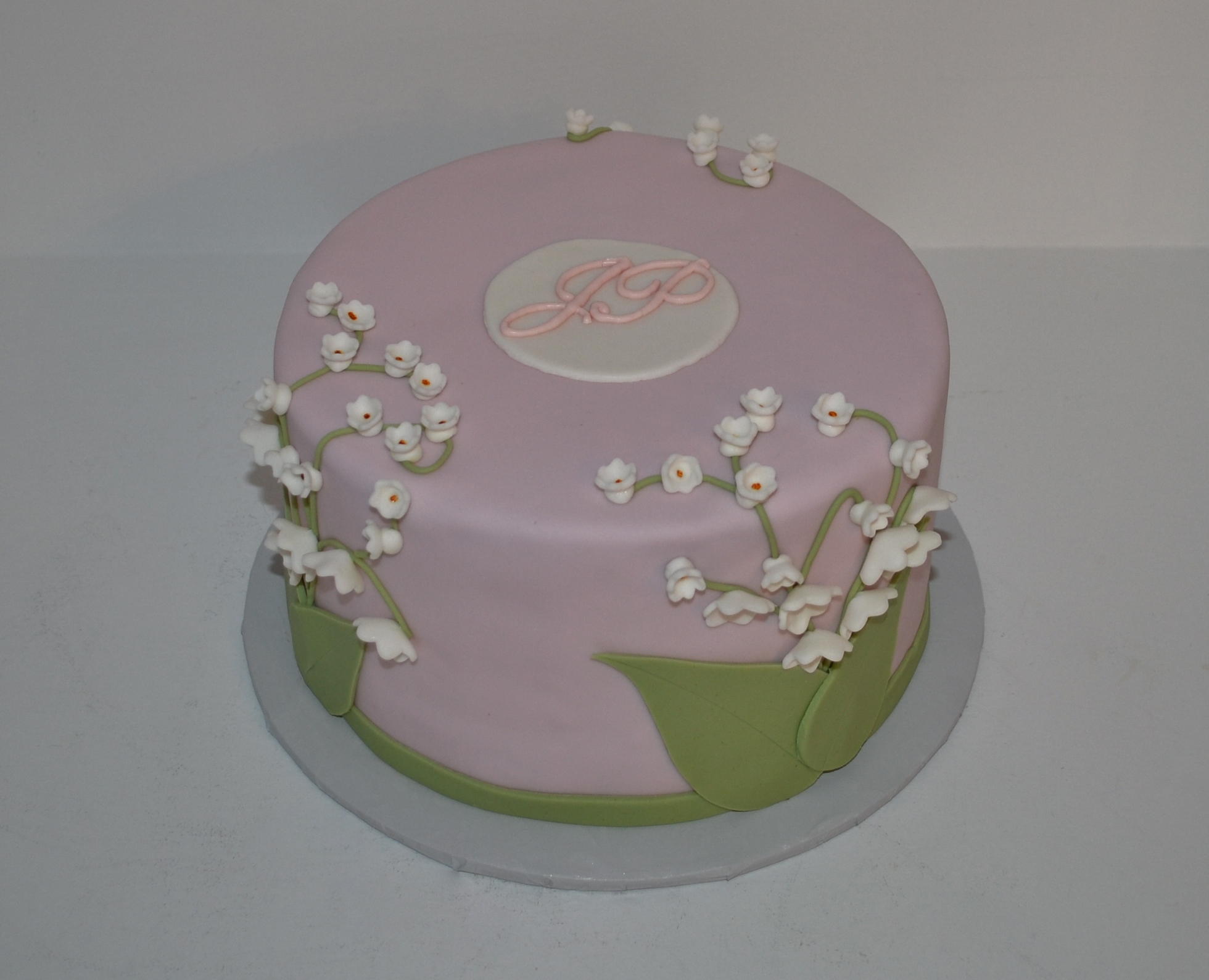 My client for this cake was buying his wife a special cake for her 60th birthday. Her favorite flower is lily of the valley so he wanted a cake that represented this. I used a very soft pink background and made small lily of the valleys out of fondant to decorate the outside of the cake. I felt that any large name would detract from the cake, so I just used his wife’s initials on top.
