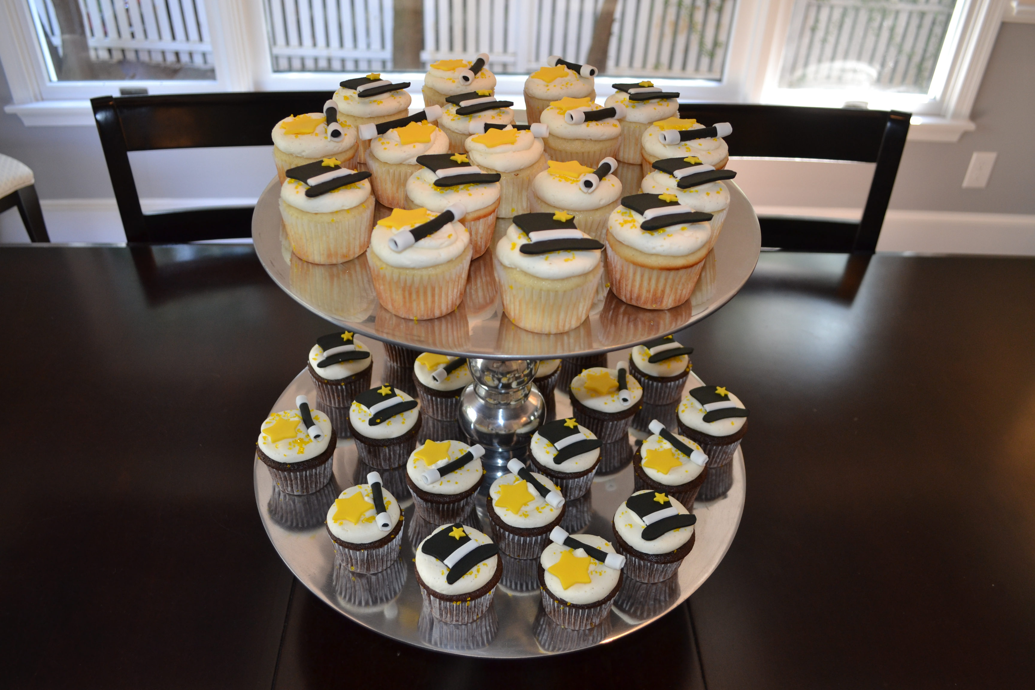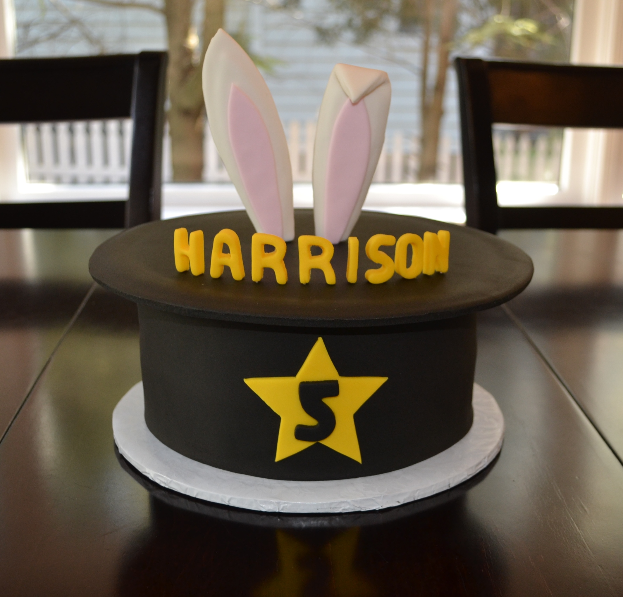 My client was looking to complement a standard cake with matching cupcakes. I made a magician’s hat cake and then paired it with standard cupcakes topped with either a magician’s hat or a magician’s wand and star.