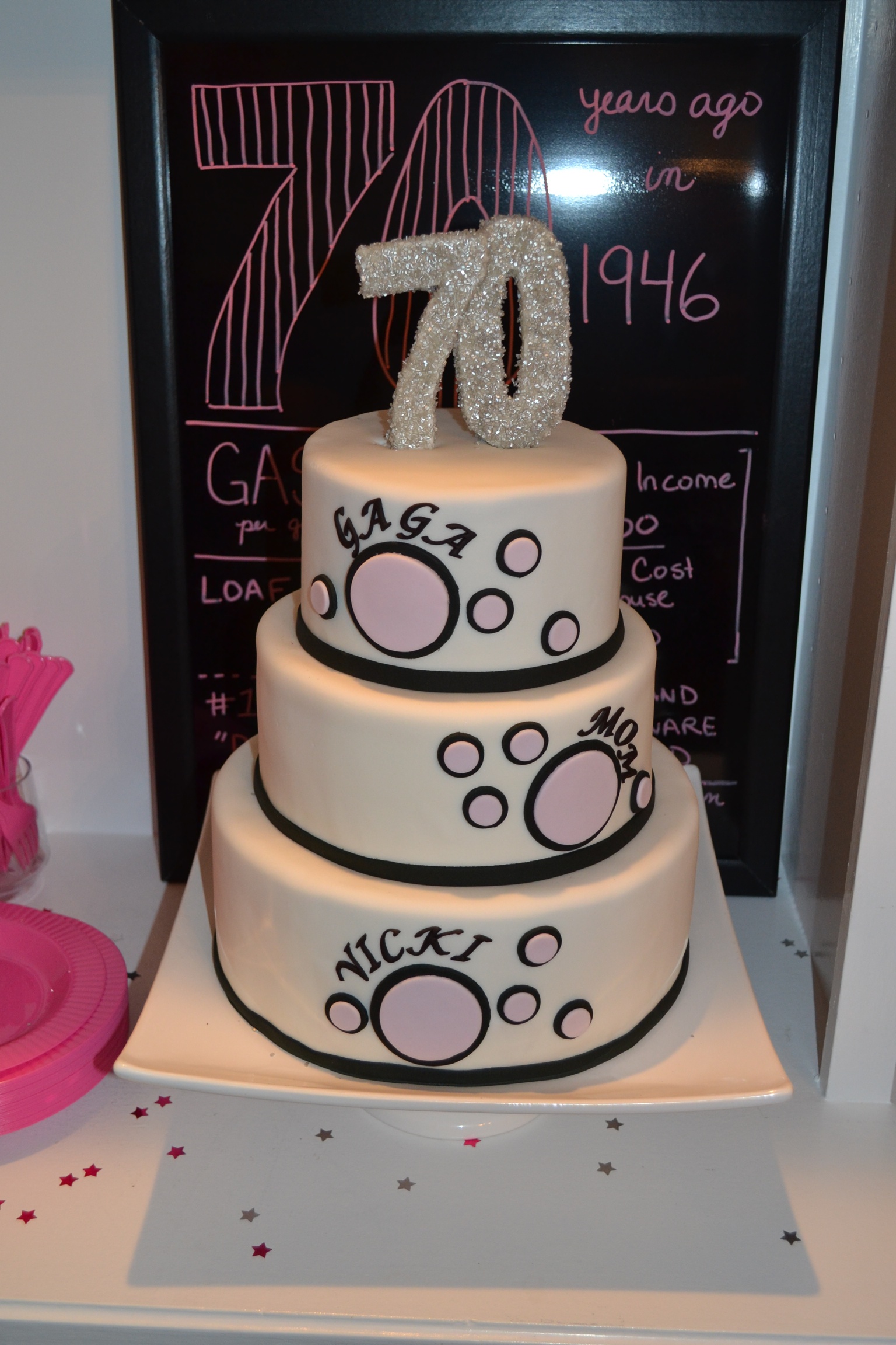 I made this cake for my mother’s 70th birthday party. I wanted something super simple but elegant so decorated it with just circles and her “3 names” in soft colors that complemented the colors of the party. I then topped it off with a sparkly “70” on top.