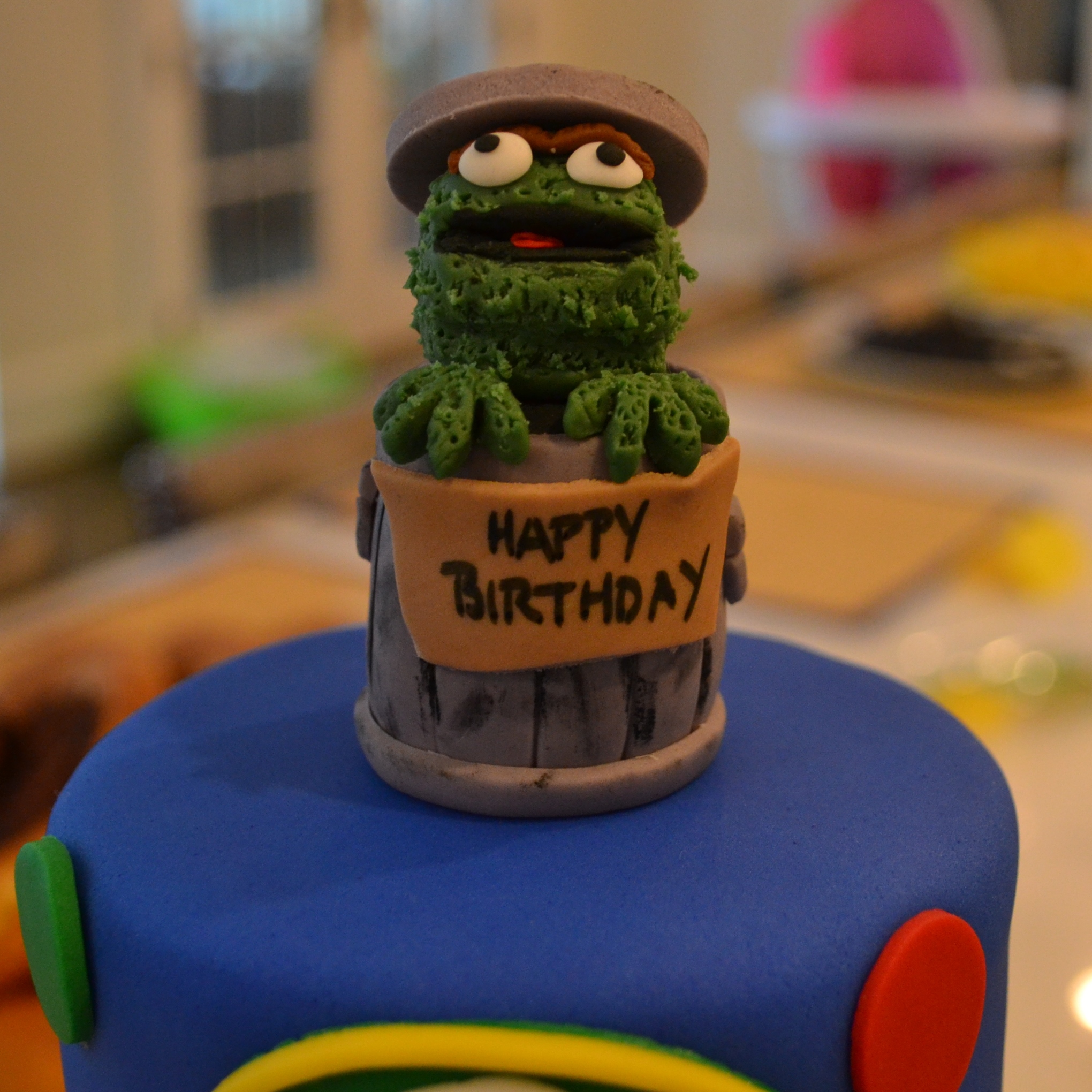My client for this cake was throwing a Sesame Street party for her daughter’s second birthday. I decorated the top and bottom tier in bright polka dots and then used the second tier for the sesame street characters. The characters that are in the middle are all around this tier. I always try to decorate the entire cake, not just the front, so that it looks good from any angle. I then made a little Oscar the Grouch to top the cake and wish her a “Happy Birthday.”