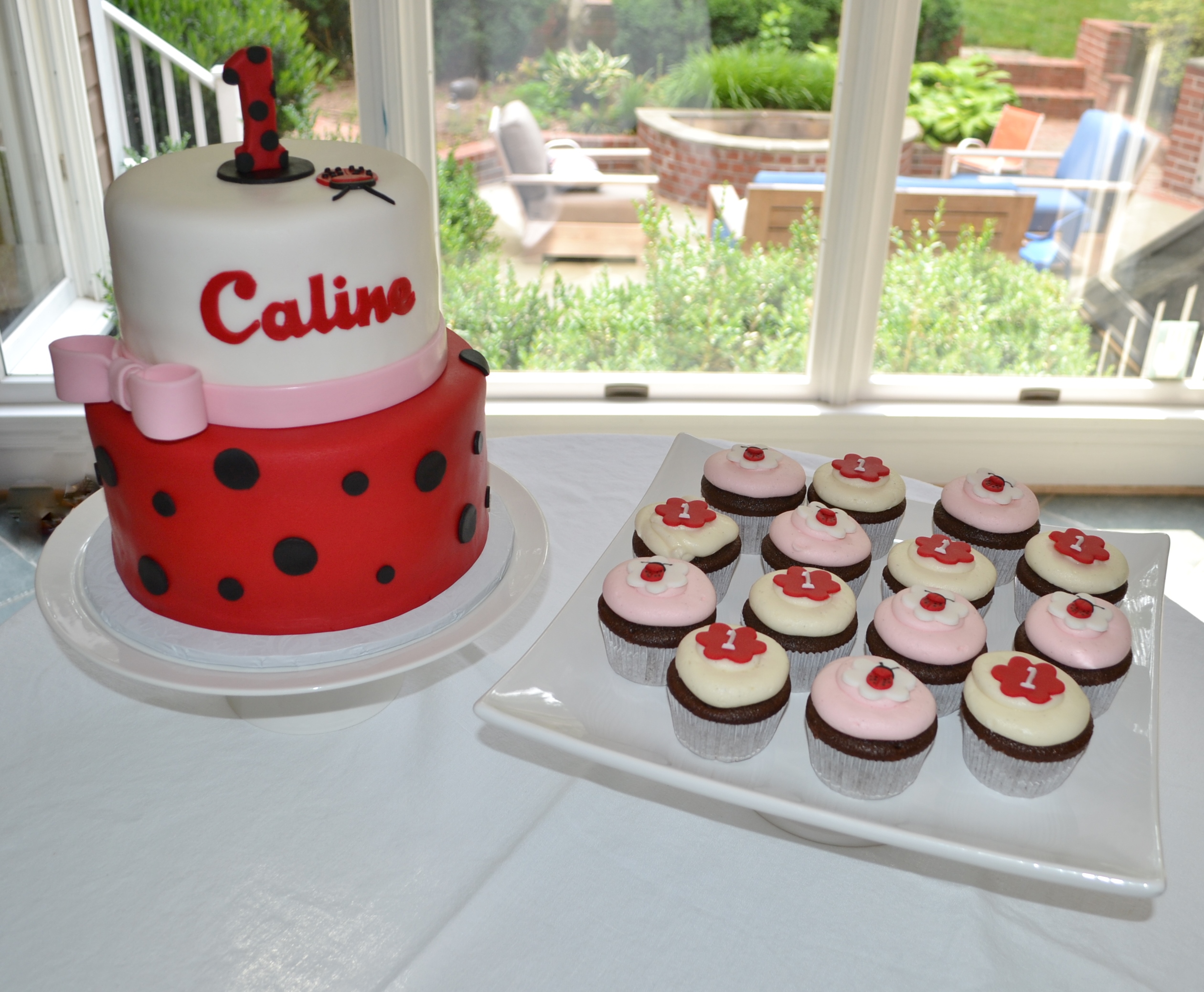 My client for this cake was throwing a 1st birthday party for her daughter and wanted a lady bug cake. She requested a two tiered cake, but then needed additional servings so supplemented with cupcakes that I decorated with flowers and the number “1” and ladybugs.