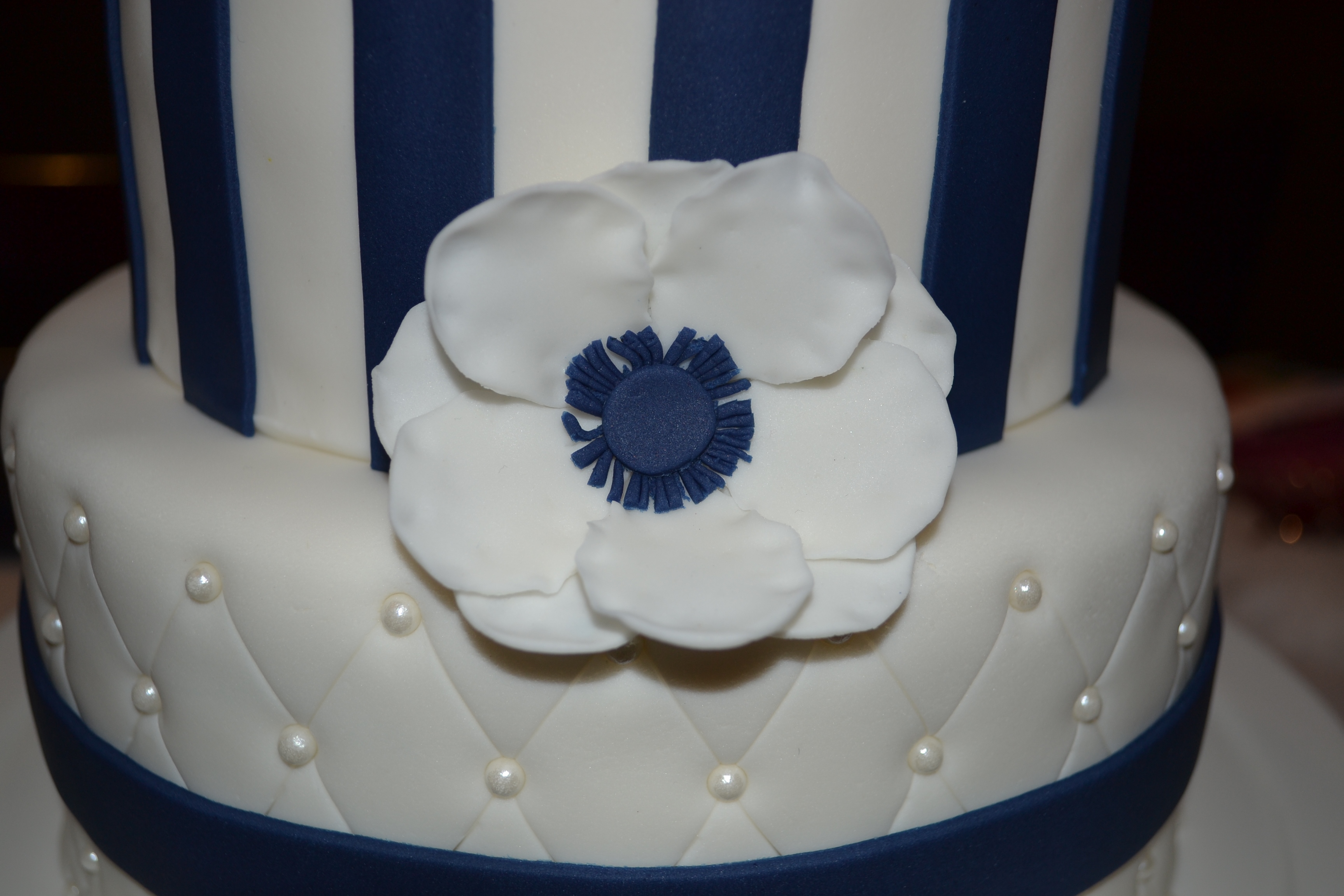My client for this cake was throwing a 90th birthday party for her mother. When she came to me, she wasn’t exactly sure what she wanted, so I worked with her extensively to figure out the perfect cake. Her mom is a very sophisticated woman and she wanted to have a sophisticated cake to match, so I sent her a few very different ideas to pick from. Once she had a basic idea, we then tweaked the specific elements (colors, flower vs. bow, polka dots vs. stripes, etc) and decided on what is in my opinion, a very classic navy and white cake. I used the quilting technique for the bottom of the cake and accented it with a flower (and added another one to the back of the cake) and then did a simple vertical stripe with a band around the top. Of course, it had to be topped with the “90” for the celebration!